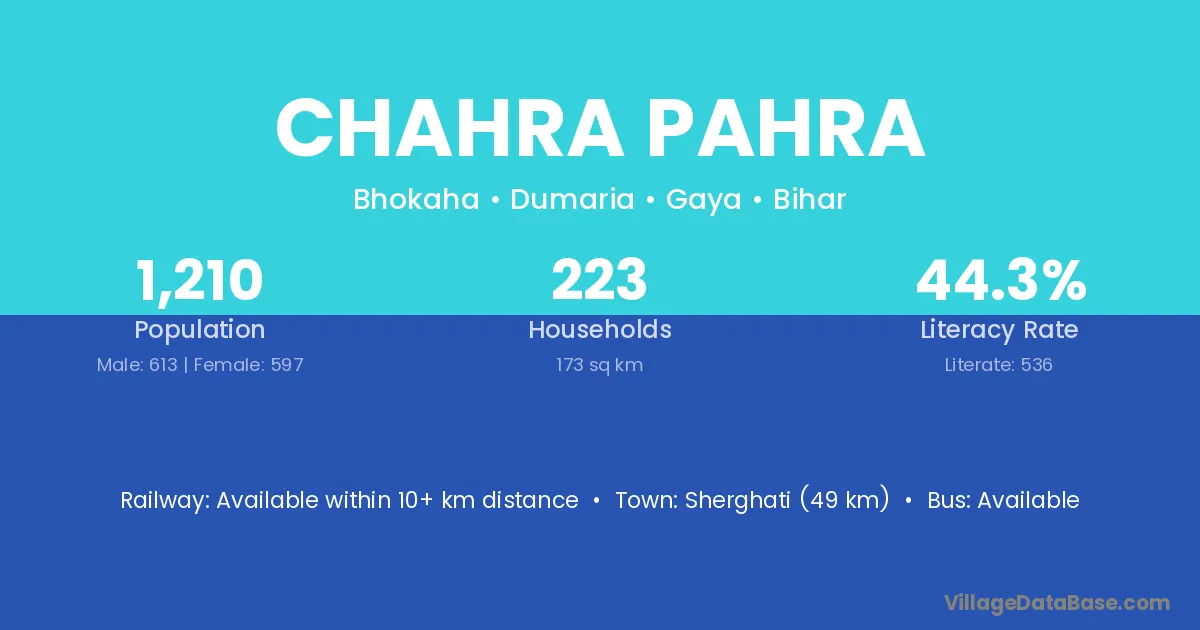 Sherghati (49 km) is the nearest town to Chahra Pahra village for major economic activities and is located approximately 49 km away.