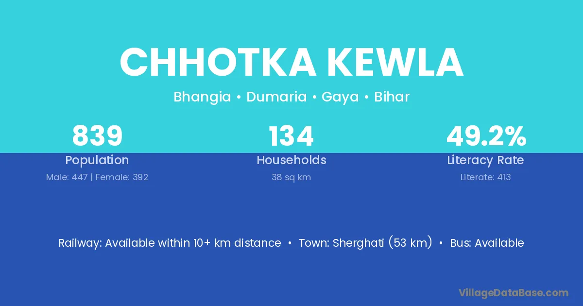 Sherghati (53 km) is the nearest town to Chhotka Kewla village for major economic activities and is located approximately 53 km away.