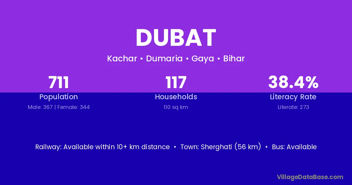 Sherghati (56 km) is the nearest town to Dubat village for major economic activities and is located approximately 56 km away.