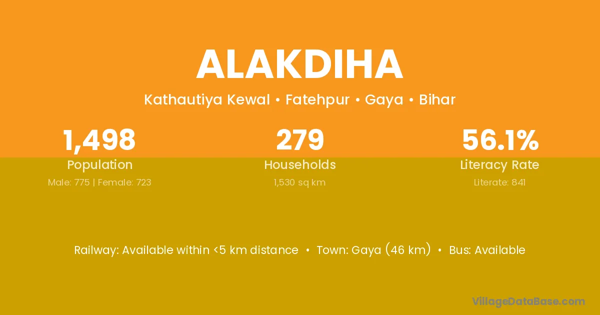 Gaya (46 km) is the nearest town to Alakdiha village for major economic activities and is located approximately 46 km away.