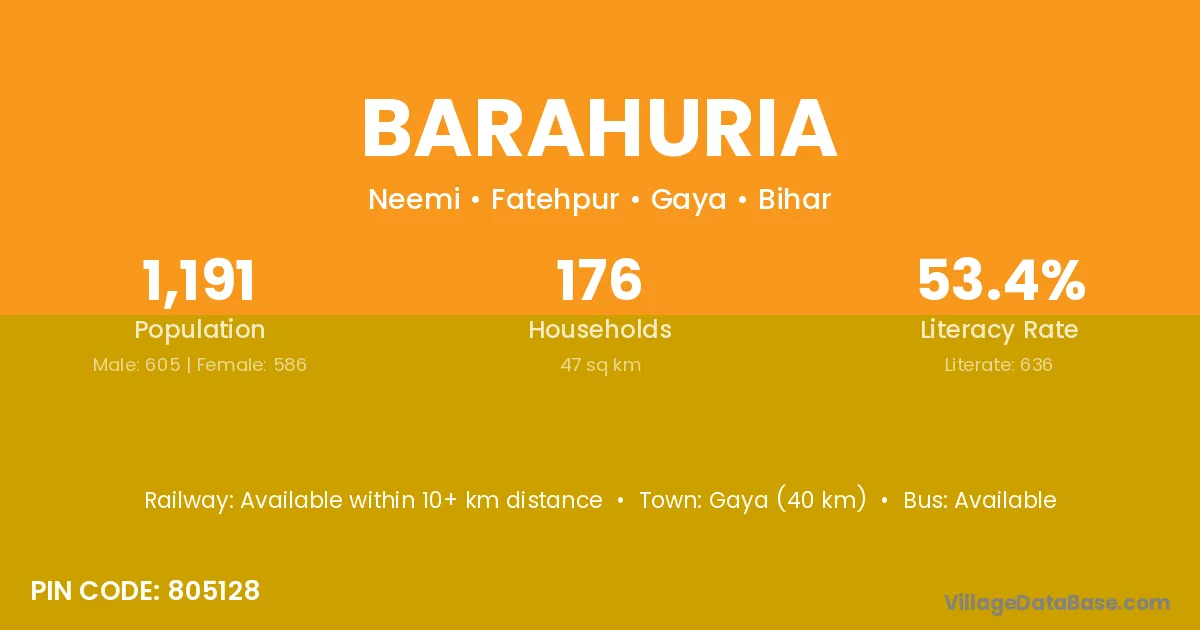 Gaya (40 km) is the nearest town to Barahuria village for major economic activities and is located approximately 40 km away.