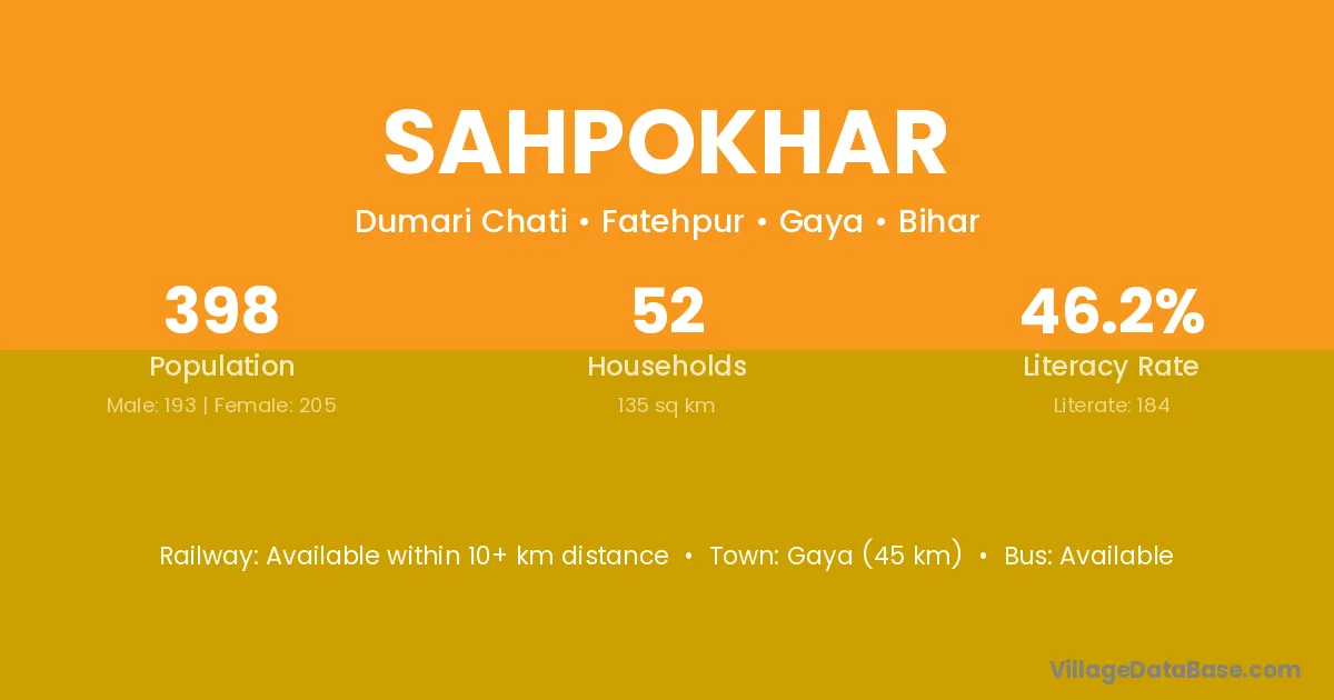 Gaya (45 km) is the nearest town to Sahpokhar village for major economic activities and is located approximately 45 km away.