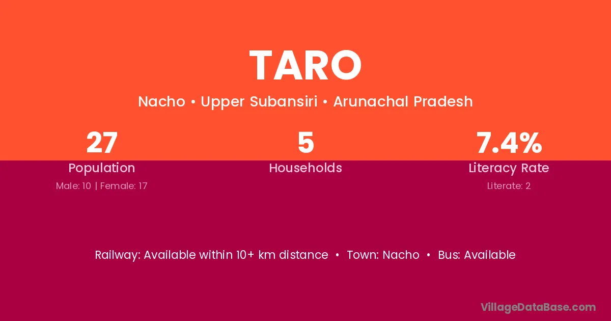 The literacy rate of Taro village is 29.60%. Male literacy stands at 37.01% and female literacy at 20.98%.