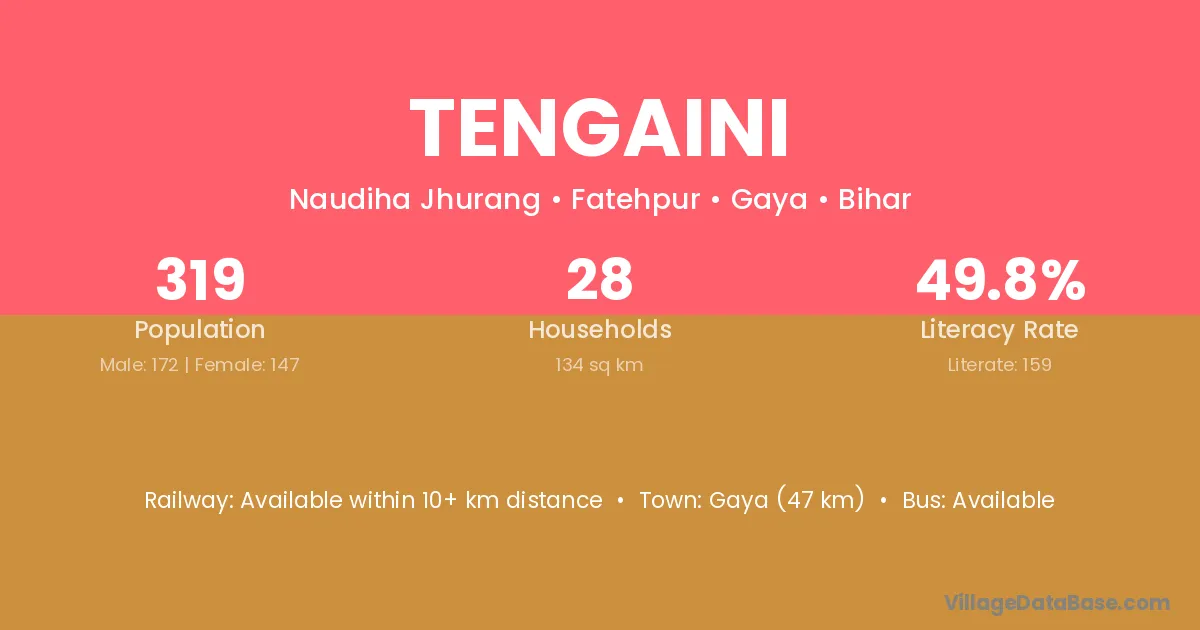 Tengaini village has a total population of 319 people, of which 172 are males and 147 are females.