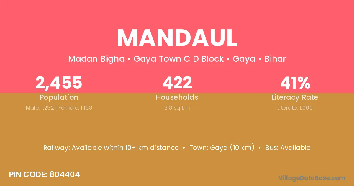 Gaya (10 km) is the nearest town to Mandaul village for major economic activities and is located approximately 10 km away.