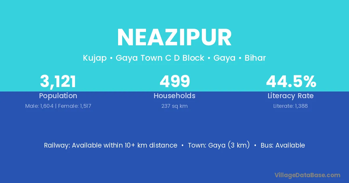 Gaya (3 km) is the nearest town to Neazipur village for major economic activities and is located approximately 3 km away.