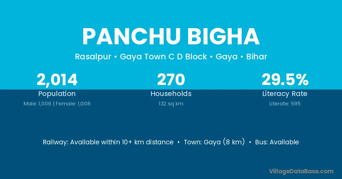 Gaya (8 km) is the nearest town to Panchu Bigha village for major economic activities and is located approximately 8 km away.