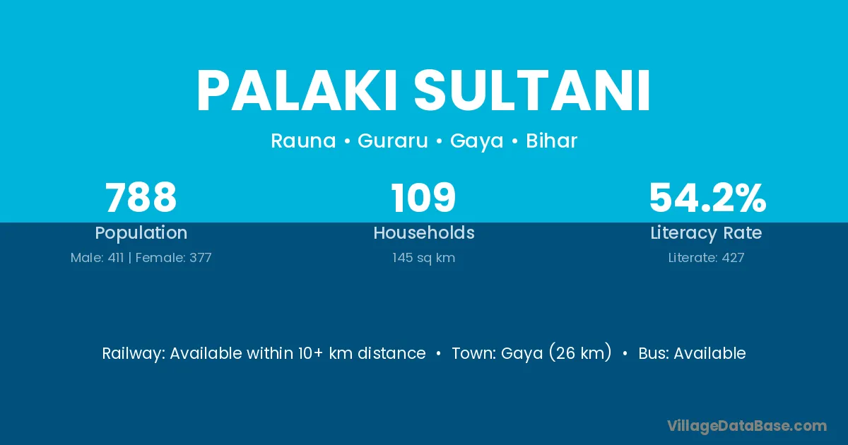 Gaya (26 km) is the nearest town to Palaki Sultani village for major economic activities and is located approximately 26 km away.