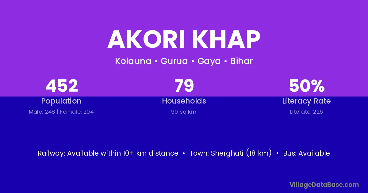 Sherghati (18 km) is the nearest town to Akori Khap village for major economic activities and is located approximately 18 km away.