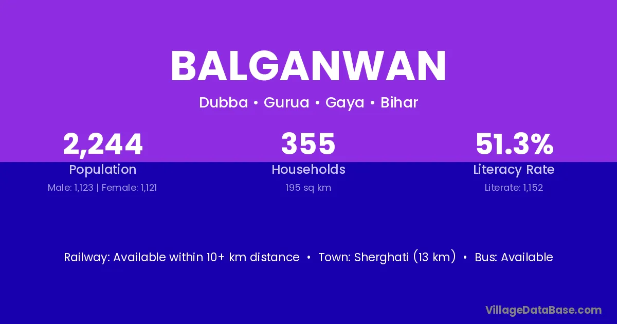 Sherghati (13 km) is the nearest town to Balganwan village for major economic activities and is located approximately 13 km away.