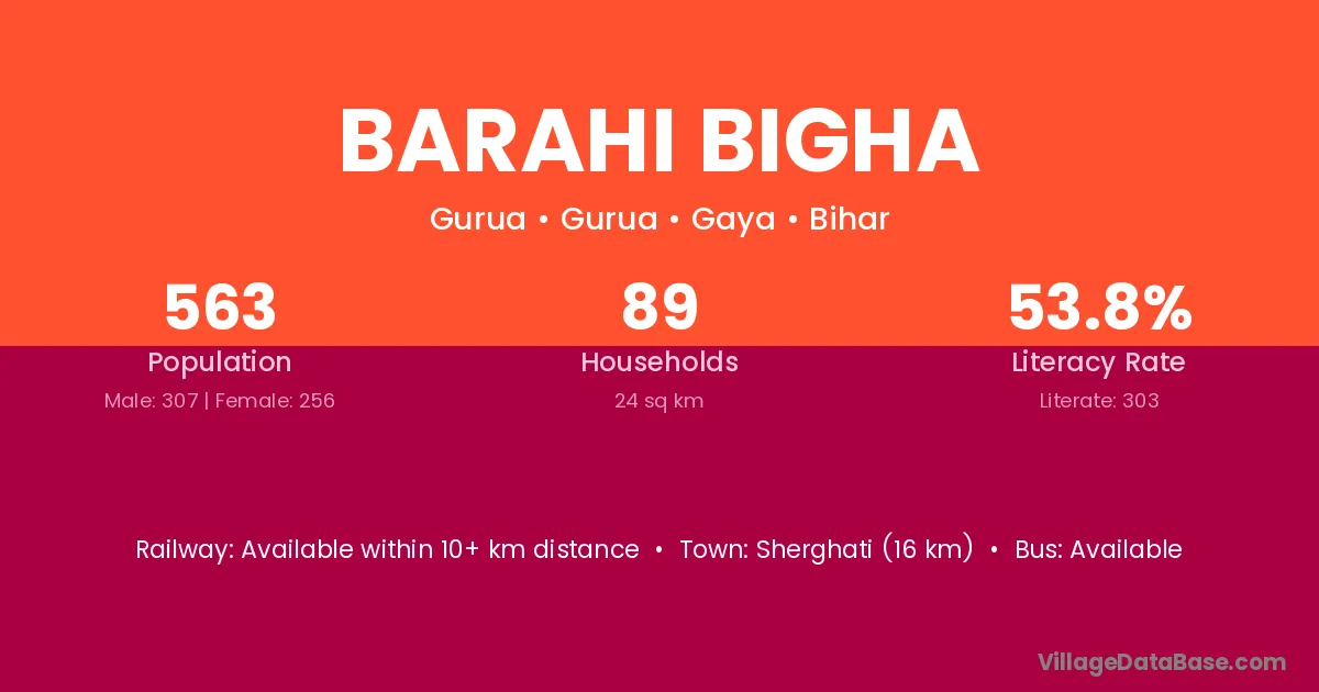 Sherghati (16 km) is the nearest town to Barahi Bigha village for major economic activities and is located approximately 16 km away.
