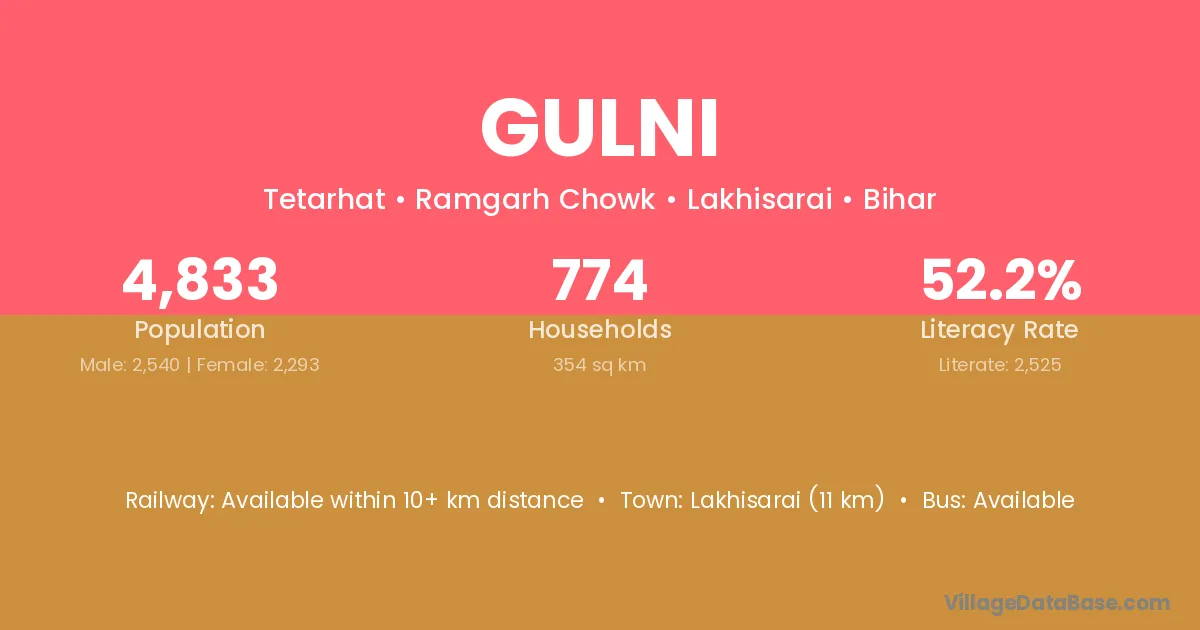 The literacy rate of Gulni village is 51.53%. Male literacy stands at 60.68% and female literacy at 41.14%.