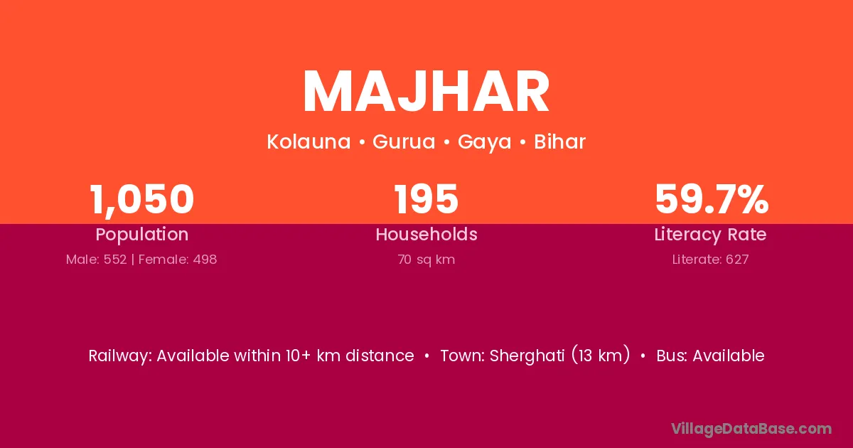 Sherghati (13 km) is the nearest town to Majhar village for major economic activities and is located approximately 13 km away.