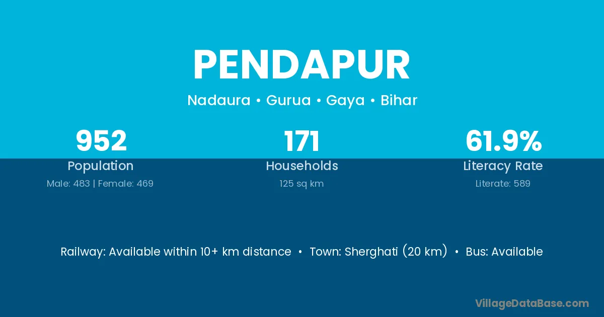 Sherghati (20 km) is the nearest town to Pendapur village for major economic activities and is located approximately 20 km away.