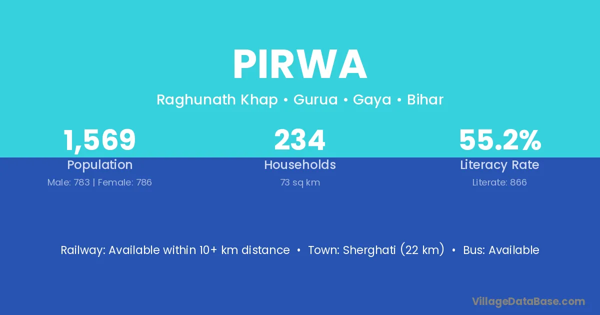 Sherghati (22 km) is the nearest town to Pirwa village for major economic activities and is located approximately 22 km away.