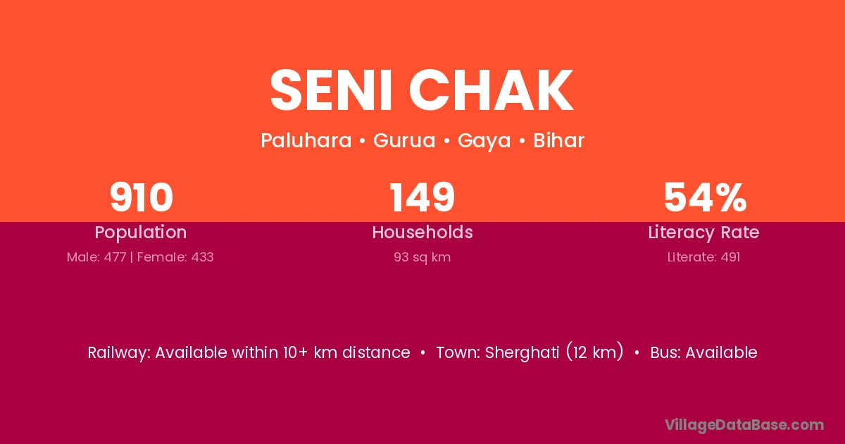Sherghati (12 km) is the nearest town to Seni Chak village for major economic activities and is located approximately 12 km away.