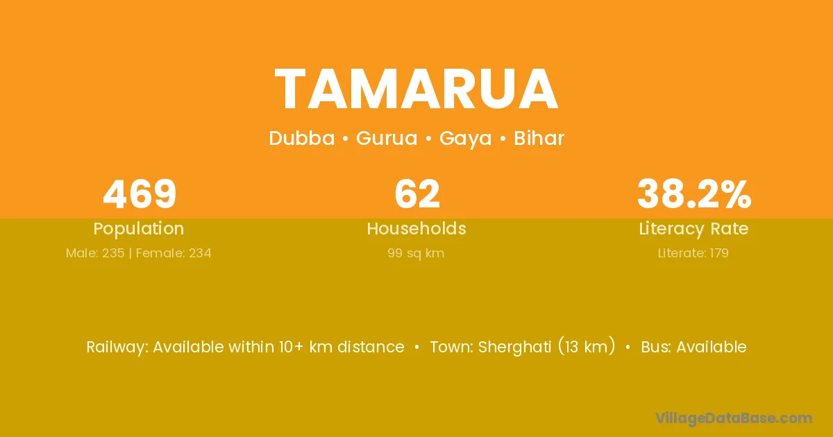 Sherghati (13 km) is the nearest town to Tamarua village for major economic activities and is located approximately 13 km away.