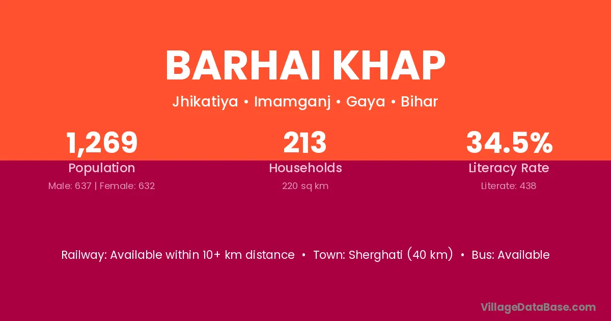Sherghati (40 km) is the nearest town to Barhai Khap village for major economic activities and is located approximately 40 km away.