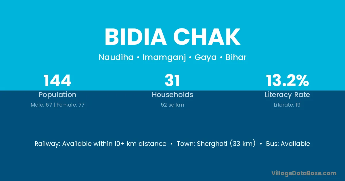 Sherghati (33 km) is the nearest town to Bidia Chak village for major economic activities and is located approximately 33 km away.