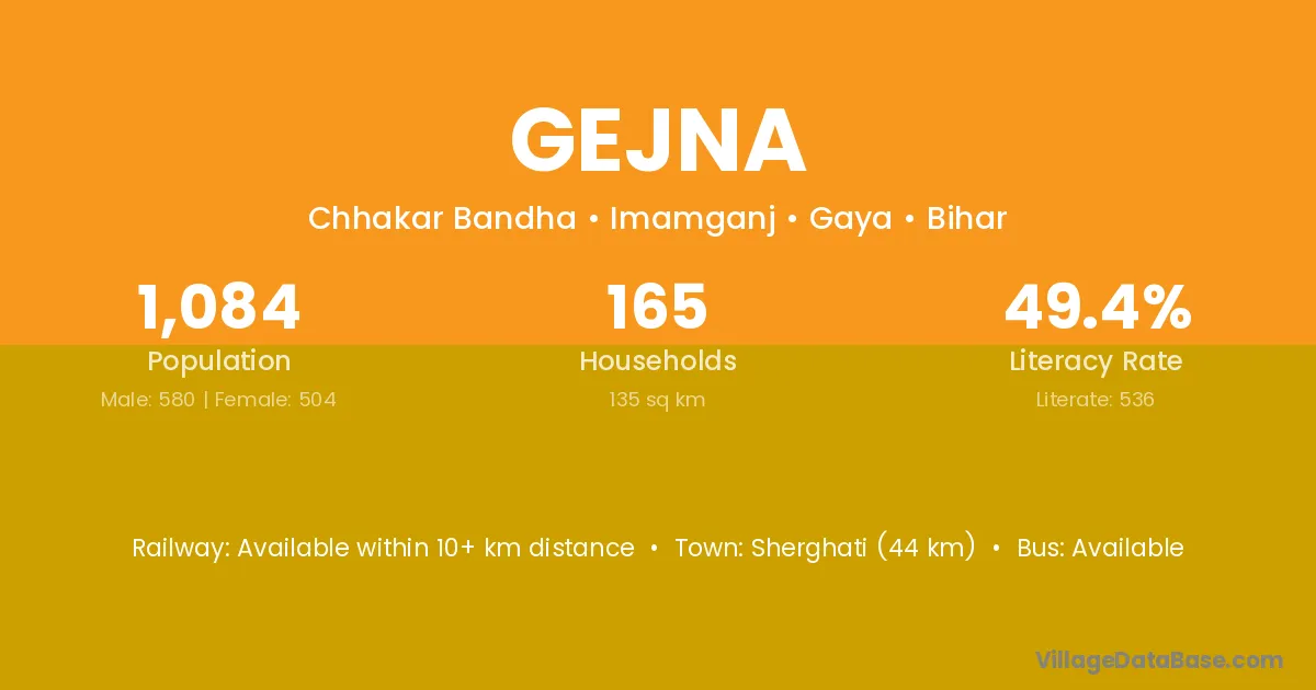 Sherghati (44 km) is the nearest town to Gejna village for major economic activities and is located approximately 44 km away.