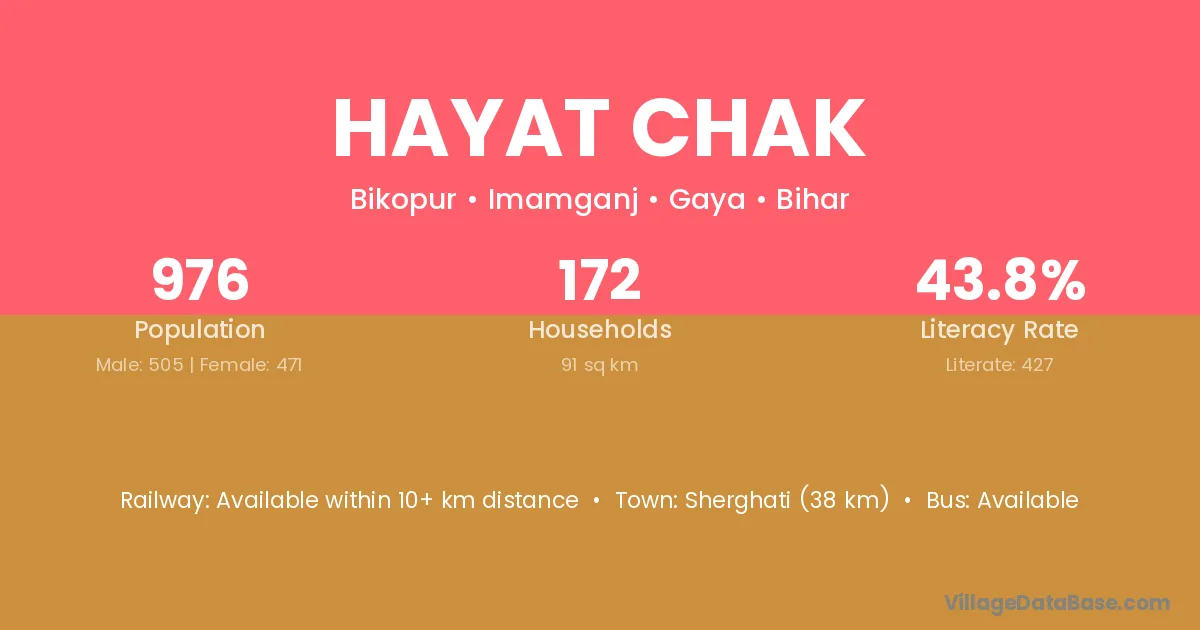 Sherghati (38 km) is the nearest town to Hayat Chak village for major economic activities and is located approximately 38 km away.