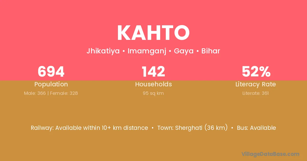 Sherghati (36 km) is the nearest town to Kahto village for major economic activities and is located approximately 36 km away.