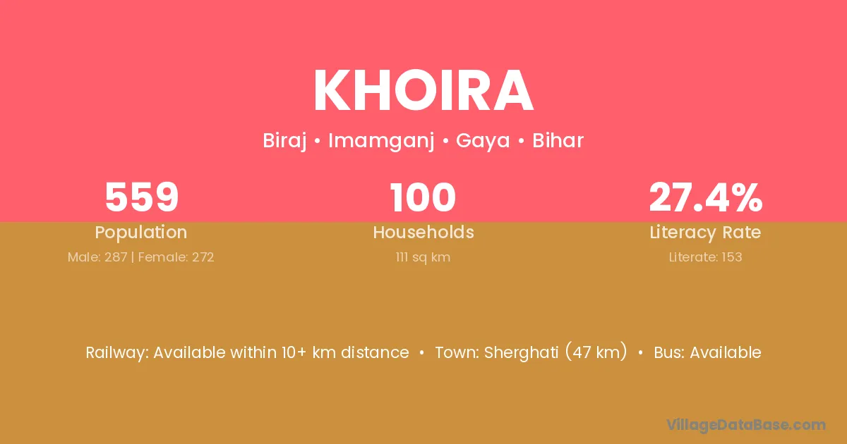 Sherghati (47 km) is the nearest town to Khoira village for major economic activities and is located approximately 47 km away.