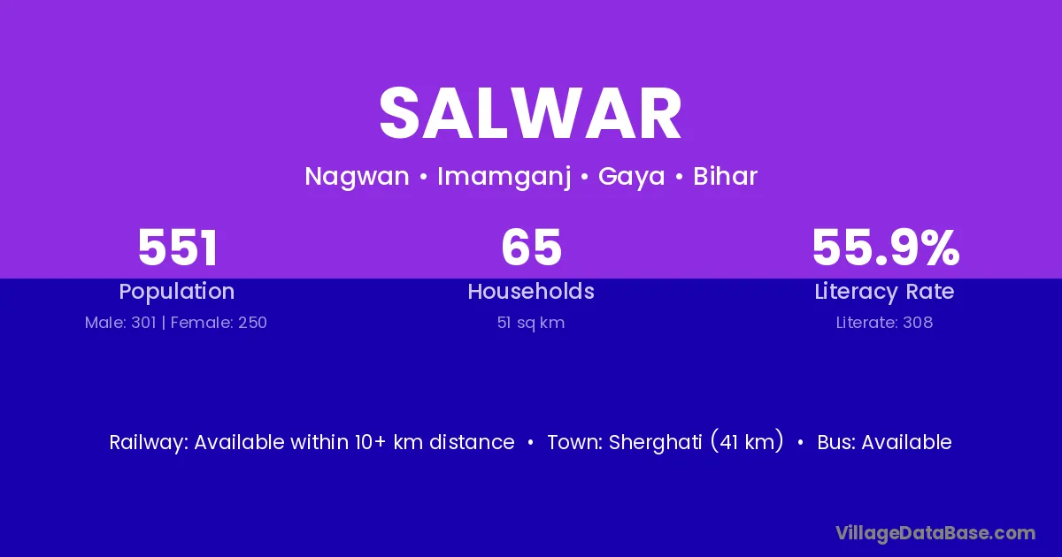 Sherghati (41 km) is the nearest town to Salwar village for major economic activities and is located approximately 41 km away.