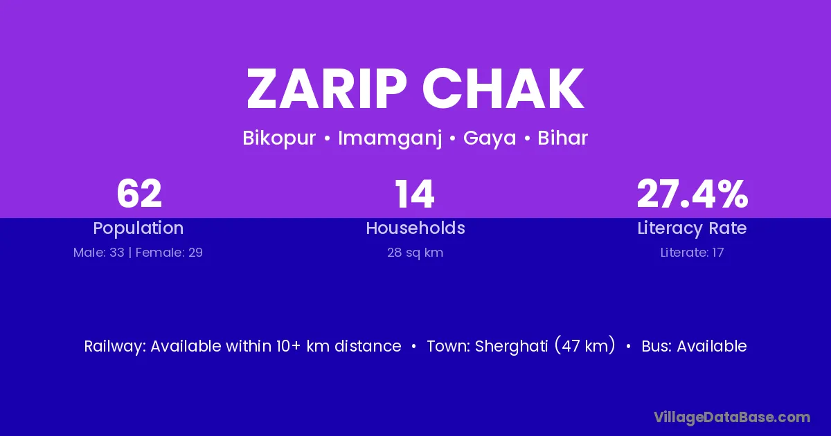Sherghati (47 km) is the nearest town to Zarip Chak village for major economic activities and is located approximately 47 km away.