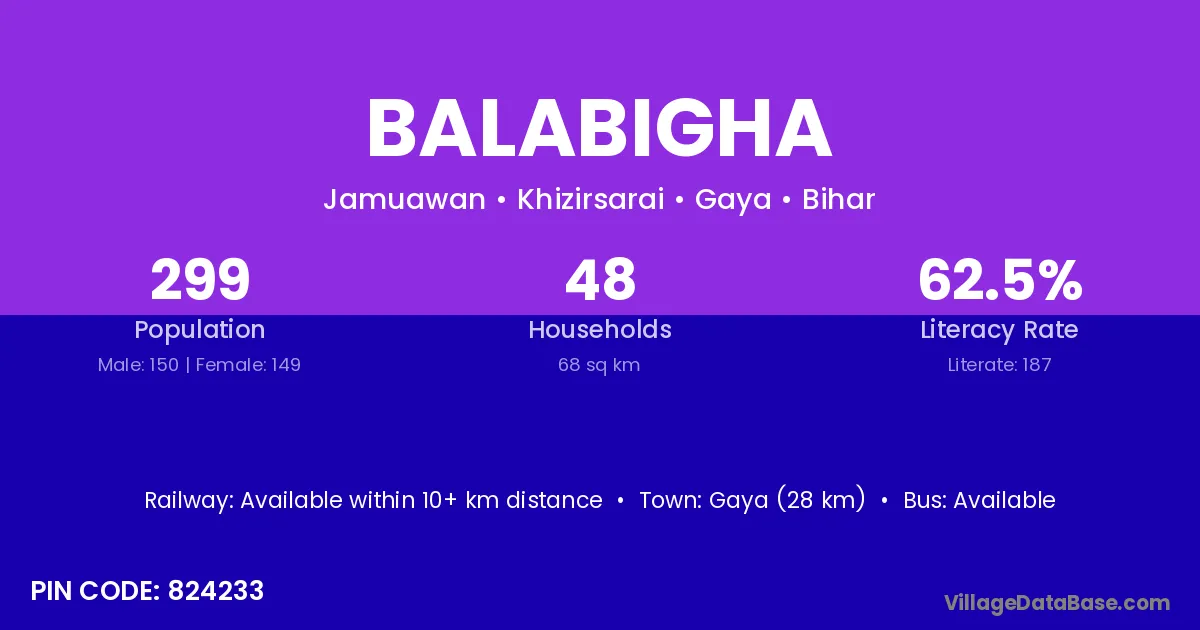 Gaya (28 km) is the nearest town to Balabigha village for major economic activities and is located approximately 28 km away.