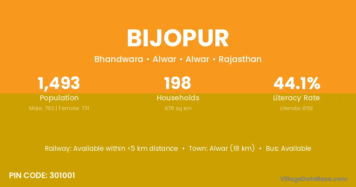 The literacy rate of Bijopur village is 48.85%. Male literacy stands at 58.04% and female literacy at 39.01%.