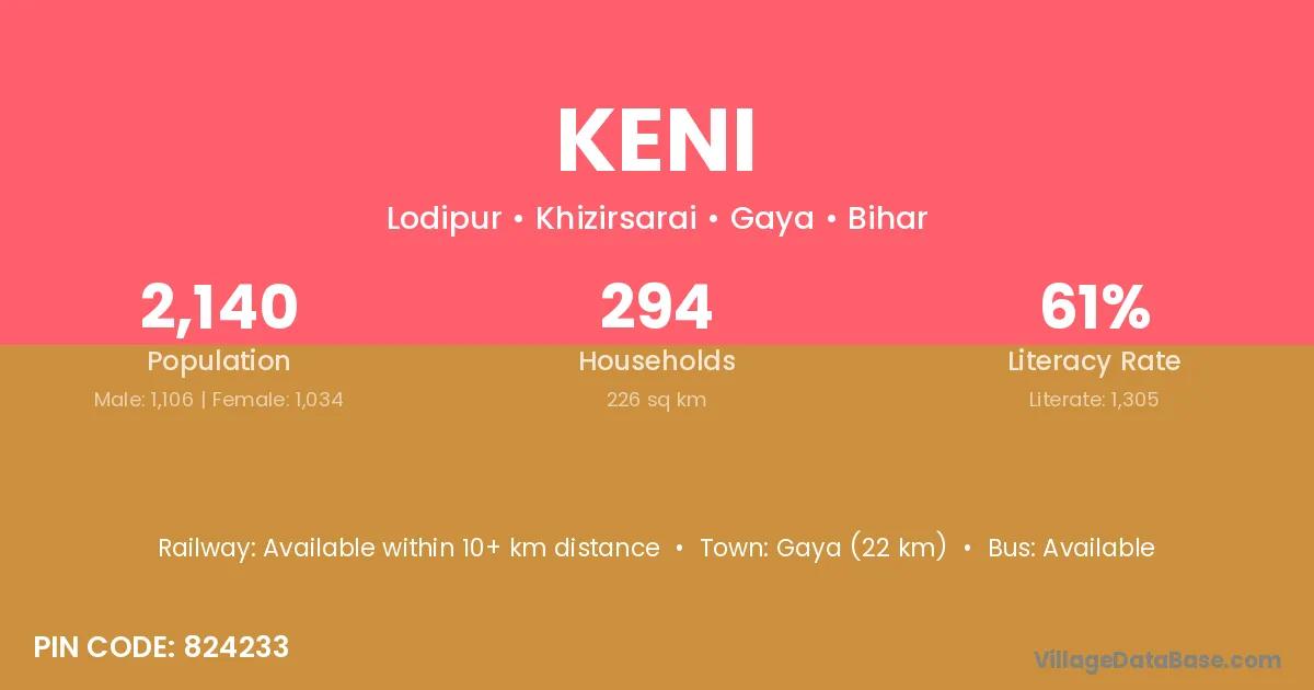 Gaya (22 km) is the nearest town to Keni village for major economic activities and is located approximately 22 km away.