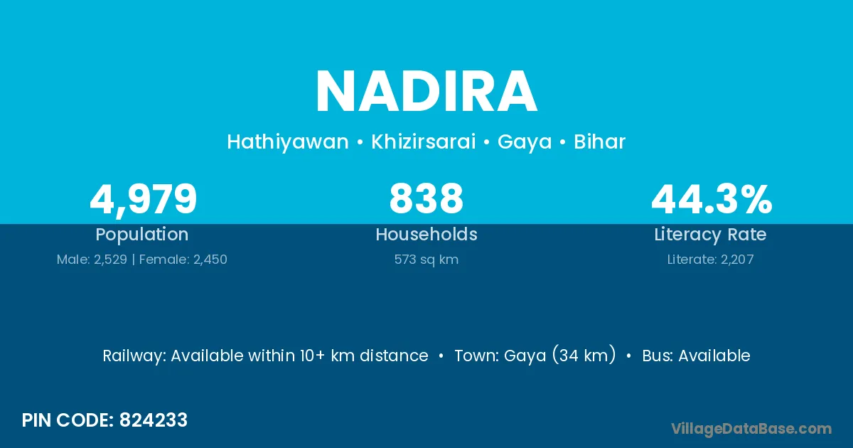Gaya (34 km) is the nearest town to Nadira village for major economic activities and is located approximately 34 km away.