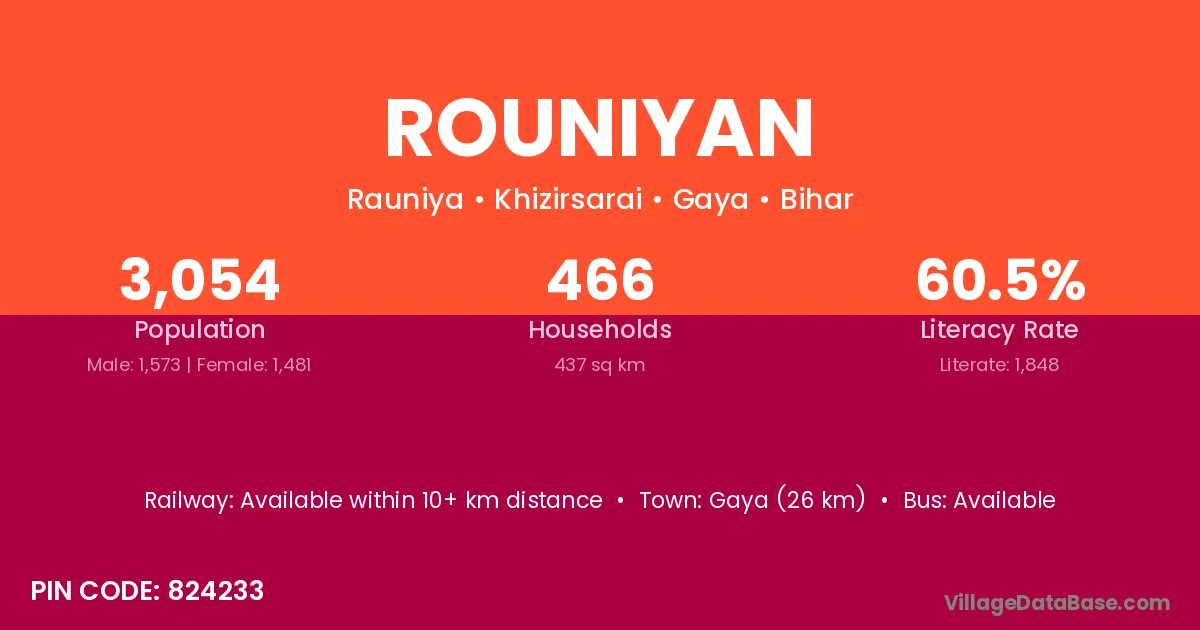Gaya (26 km) is the nearest town to Rouniyan village for major economic activities and is located approximately 26 km away.