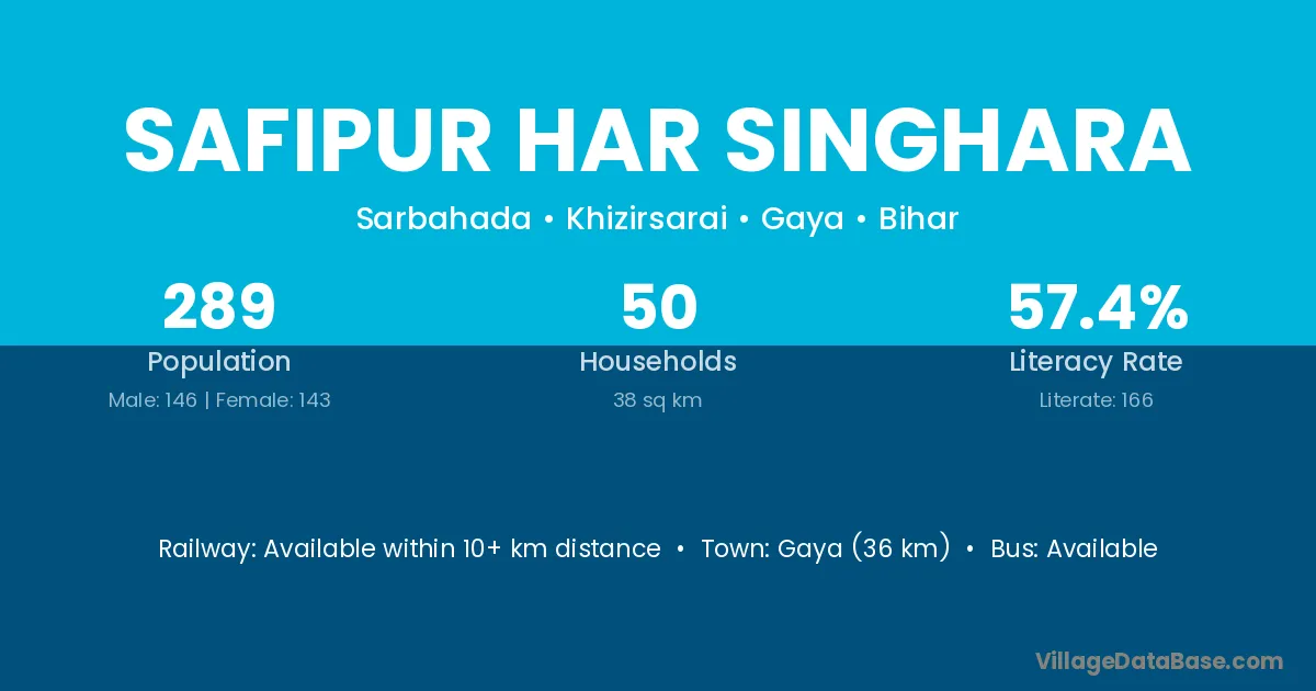 Gaya (36 km) is the nearest town to Safipur Har Singhara village for major economic activities and is located approximately 36 km away.