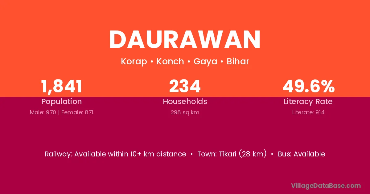 Tikari (28 km) is the nearest town to Daurawan village for major economic activities and is located approximately 28 km away.