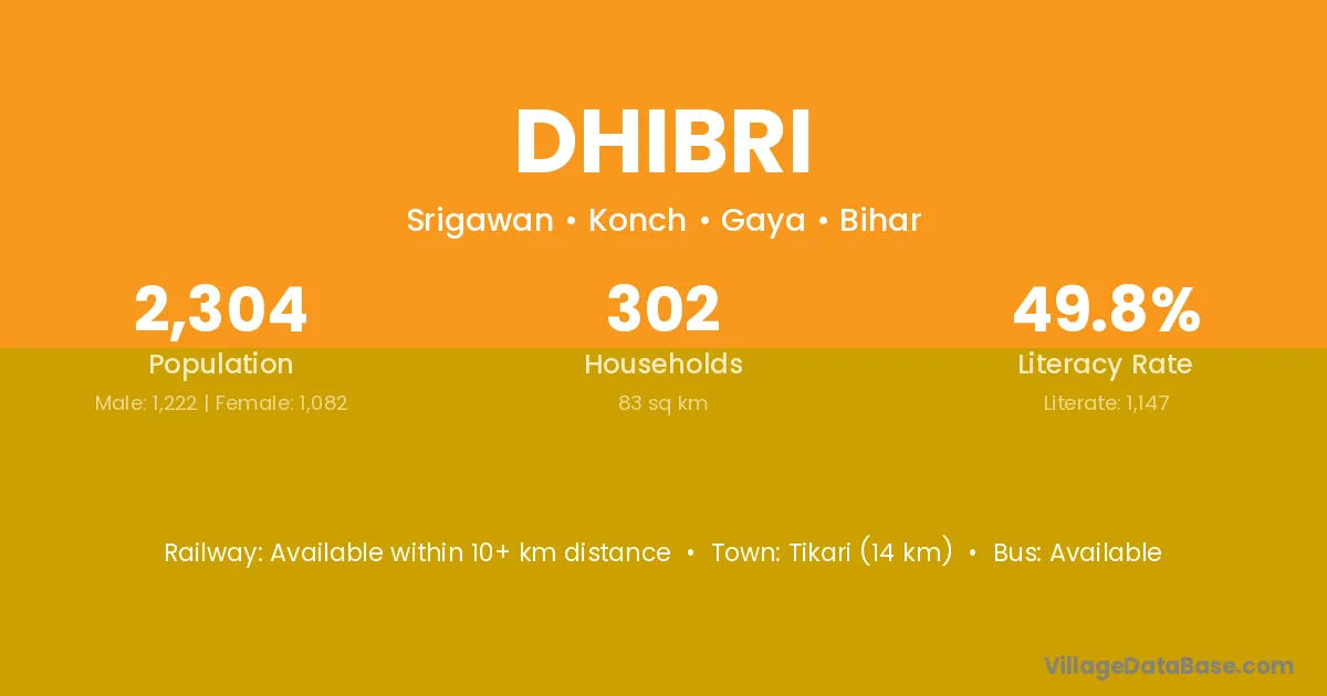 Tikari (14 km) is the nearest town to Dhibri village for major economic activities and is located approximately 14 km away.