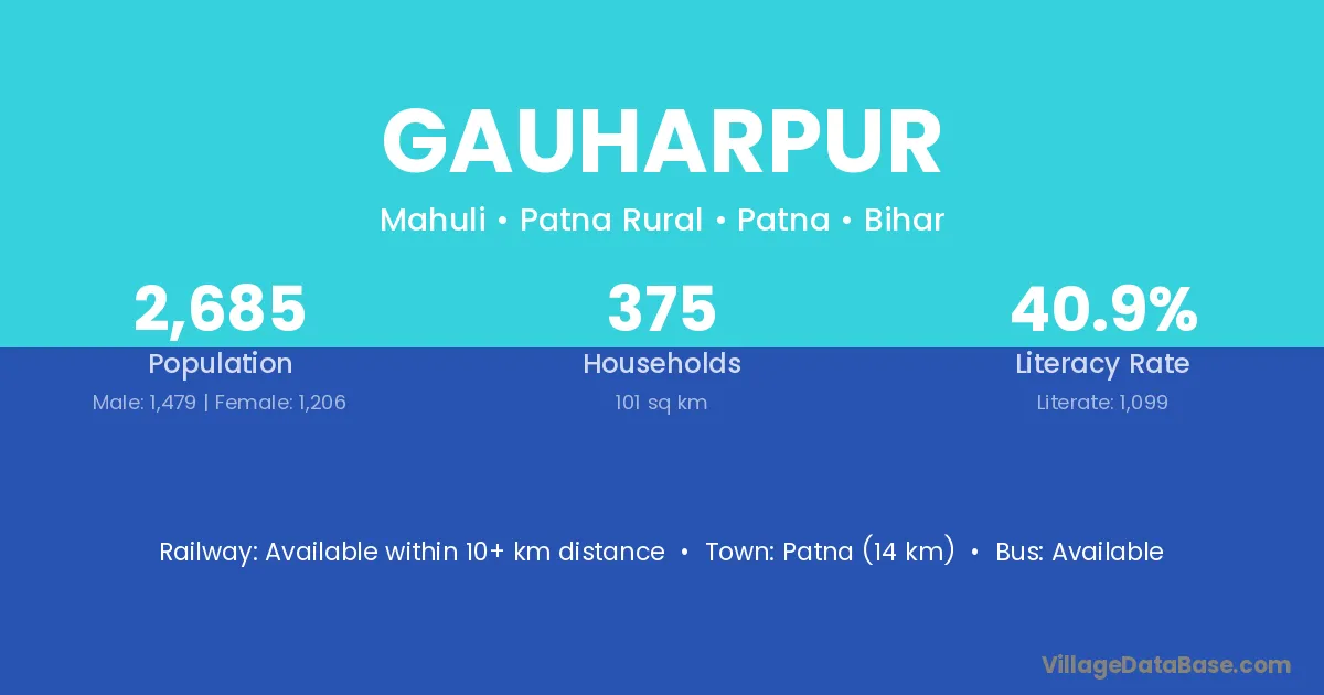 Tikari (10 km) is the nearest town to Gauharpur village for major economic activities and is located approximately 10 km away.