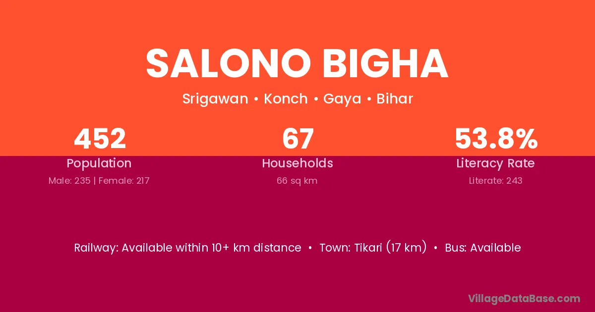 Salono Bigha village has a total population of 452 people, of which 235 are males and 217 are females.