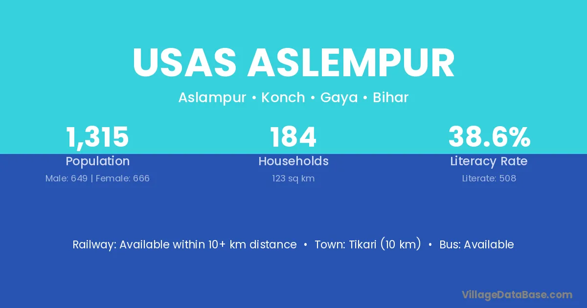 Usas Aslempur village has a total population of 1,315 people, of which 649 are males and 666 are females.