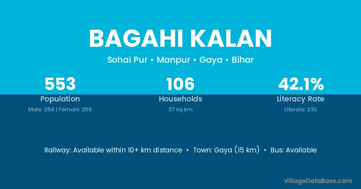Bagahi Kalan village has a total population of 553 people, of which 284 are males and 269 are females.