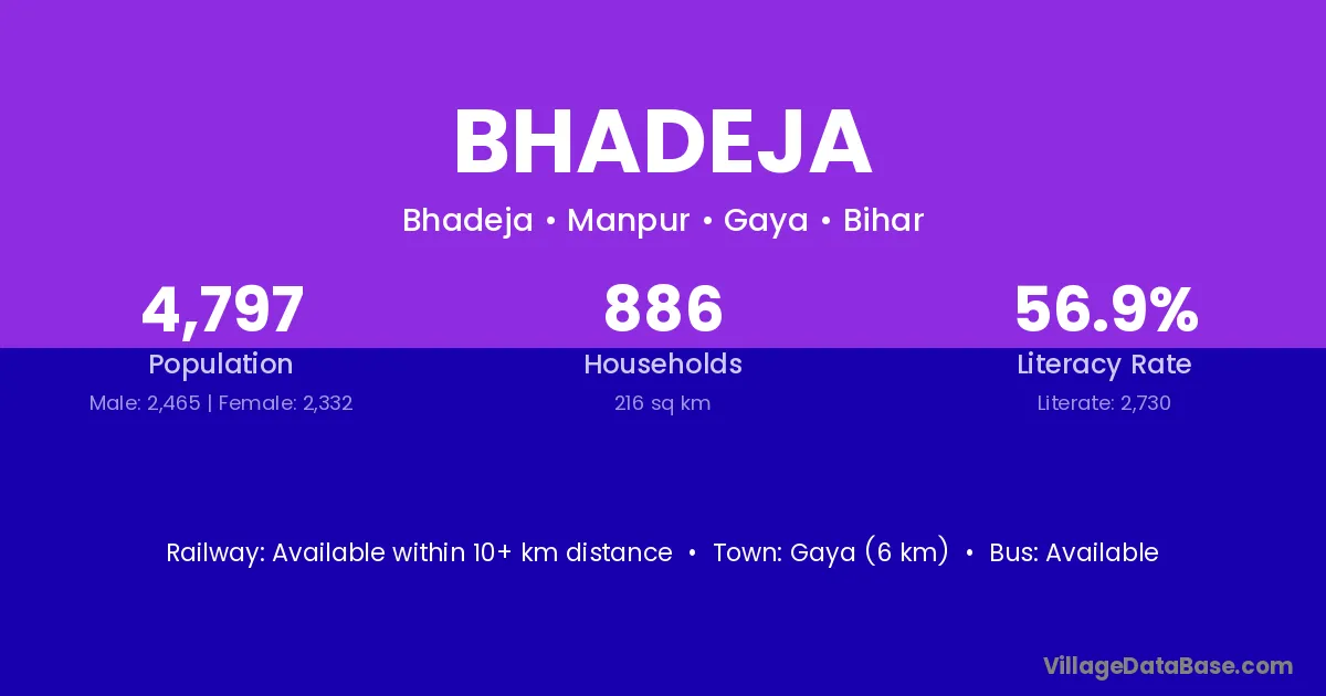 Gaya (6 km) is the nearest town to Bhadeja village for major economic activities and is located approximately 6 km away.