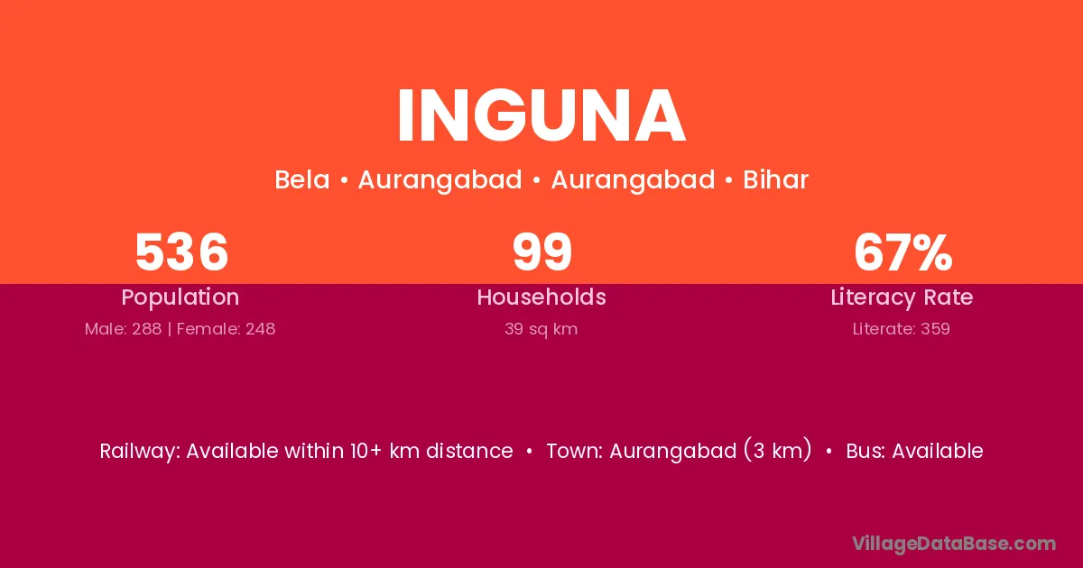 The literacy rate of Inguna village is 57.45%. Male literacy stands at 64.22% and female literacy at 50.00%.