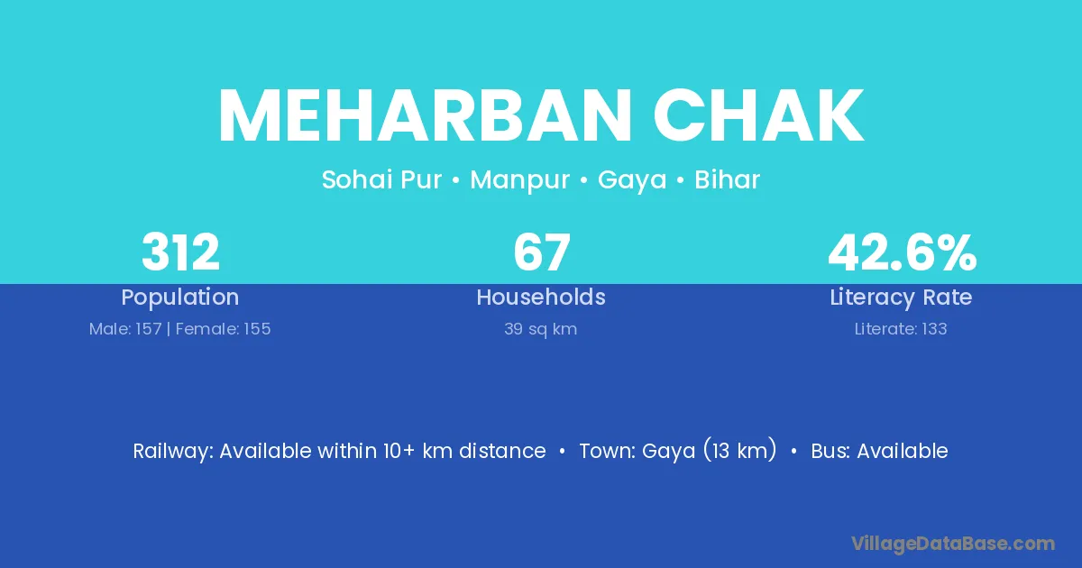 Gaya (13 km) is the nearest town to Meharban Chak village for major economic activities and is located approximately 13 km away.
