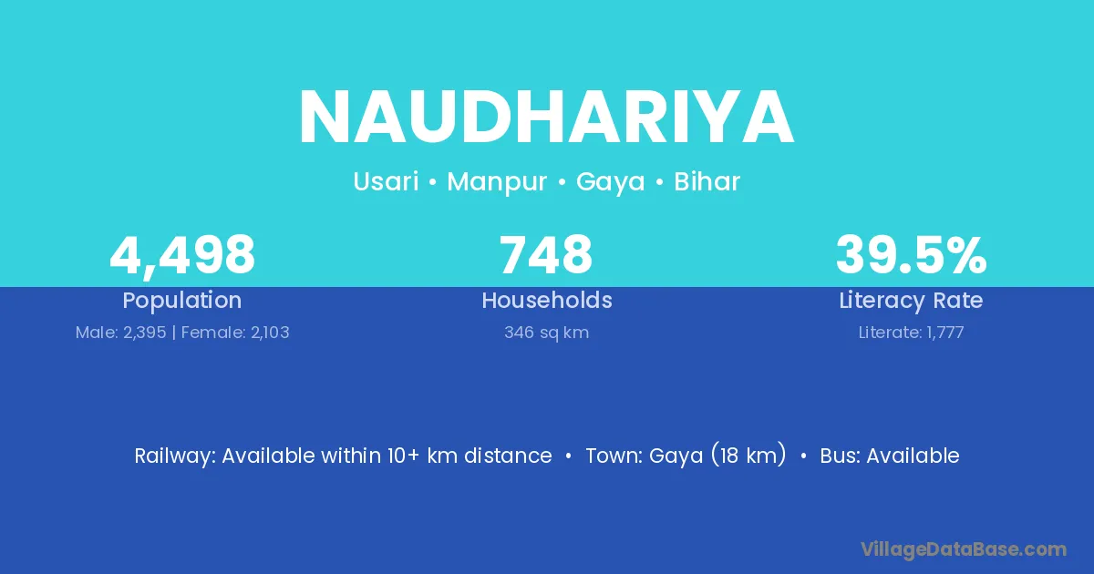 Gaya (18 km) is the nearest town to Naudhariya village for major economic activities and is located approximately 18 km away.