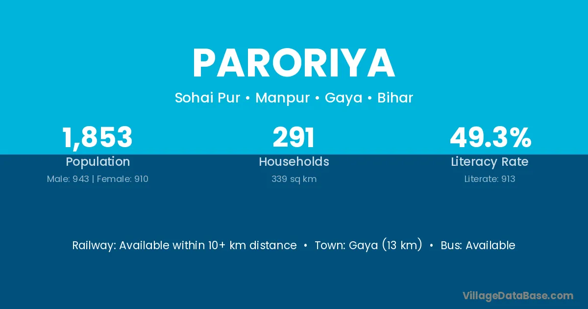 Gaya (13 km) is the nearest town to Paroriya village for major economic activities and is located approximately 13 km away.