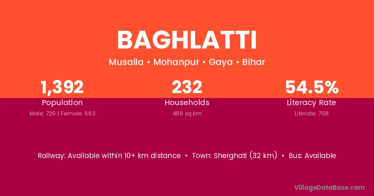 Sherghati (32 km) is the nearest town to Baghlatti village for major economic activities and is located approximately 32 km away.
