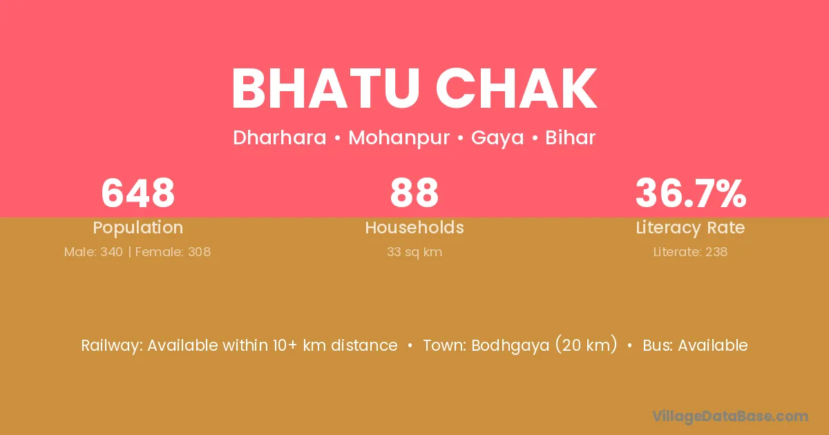 Bodhgaya (20 km) is the nearest town to Bhatu Chak village for major economic activities and is located approximately 20 km away.