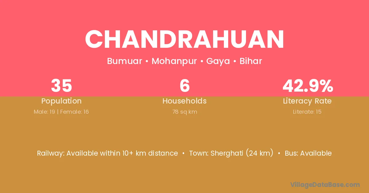 Sherghati (24 km) is the nearest town to Chandrahuan village for major economic activities and is located approximately 24 km away.
