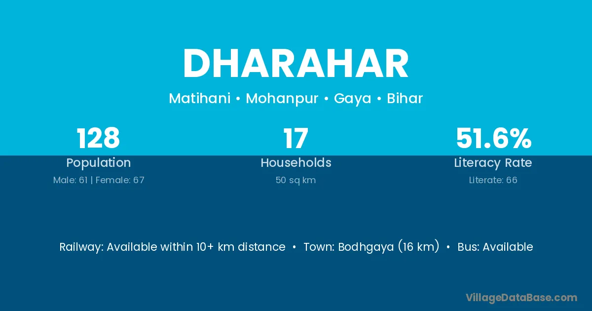 Bodhgaya (16 km) is the nearest town to Dharahar village for major economic activities and is located approximately 16 km away.